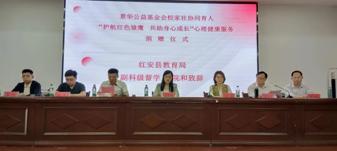 5月16日下午,景华公益基金会校家社协同育人“护航红色雏鹰 共助身心成长”心理健康服务捐赠仪式在县职教中心举行。景华公益基金会、广东省现代家庭研究院,红安县委统一战线工作部、县教育局相关负责人出席捐赠仪式。列宁小学、列宁小学基伟校区、实验小学虎门校区、中国工农红军湖北红安董必武红军小学代表,职教中心校党委成员、各学部管理干部、全体班主任、35岁以下青年教师参加活动。